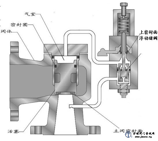 當被保護系統處于正常運行狀況時,導閥閥瓣處于關閉狀態。系統壓力從主閥進口通過導管和導閥傳入主閥閥瓣(活塞)上方氣室。由于活塞面積大于閥瓣密封面面積,系統壓力對閥瓣產生一個向下的合力,使主閥處于關閉、密封狀態。當系統壓力升高達到整定壓力時,導閥開啟,同時滑閥向上移動封閉導閥的進氣通道。主閥閥瓣上方氣室的介質經由打開的導閥排出,使主閥閥瓣上方壓力降低。主閥閥瓣在進口壓力的推動下打開而使系統卸壓。